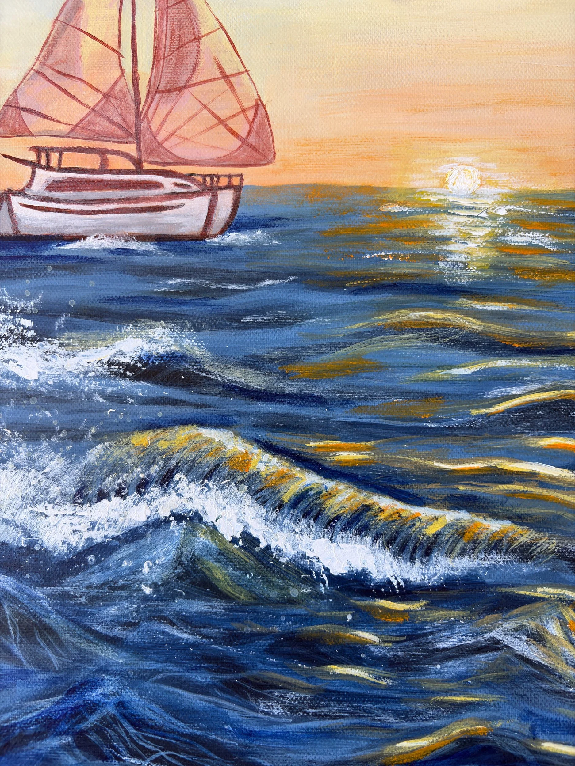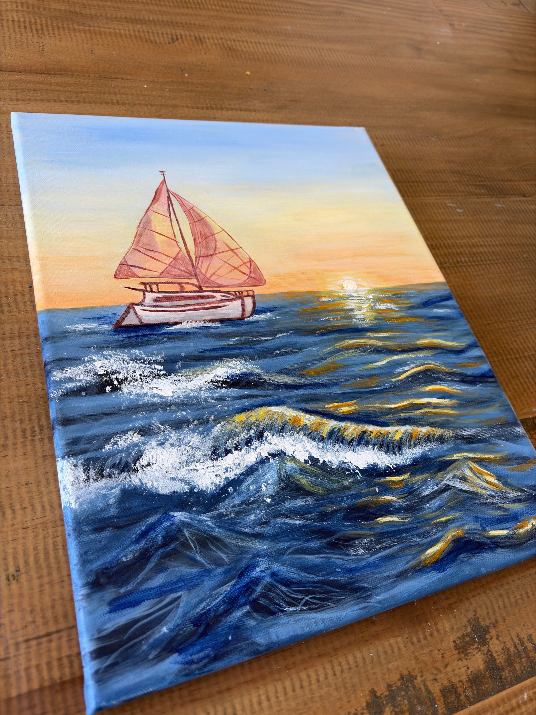 The Long Way Home is an original ocean landscape painting inspired by quiet moments at sea and the beauty of slowing down. A single sailboat glides across rolling blue waves as the sun sinks low on the horizon, casting golden light across the water. The warm sky and glowing reflections create a sense of calm, nostalgia, and gentle movement. Painted with expressive brushstrokes and layered blues and golds, this piece captures the feeling of choosing the scenic route—where the journey itself becomes the destination. It’s a reminder of peace, reflection, and finding comfort in taking your time.